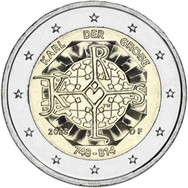 Pamätná bimetalová minca Nemecka 2023, nominálnej hodnoty 2 EURO, "1275. výročie narodenia Karola Veľkého, kráľa Frankov a rímskeho cisára" - mincovňa F.