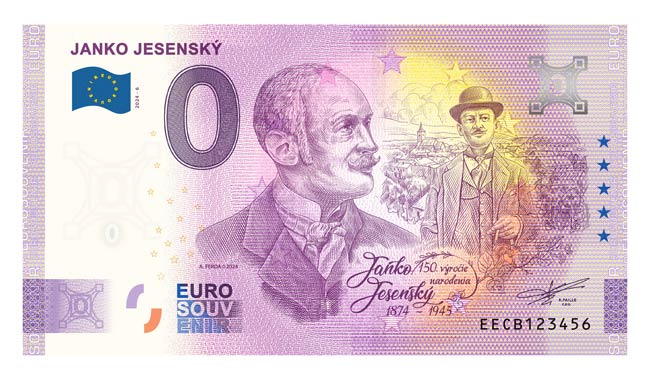 Janka Jesenského pripomenie aj vydanie Euro Souveniru, tzv. 0 Eurovky, ktorej autorom je Adrian Ferda. Na motíve zachytil Janka Jesenského v netradičnom profilovom zábere. V pozadí sa nachádza rodná obec Turčiansky Sv. Martin (dnešný Martin), pred ktorým je ešte raz zobrazený ako právnik v typickom klobúku a elegantnom meštiackom oblečení. Zberatelia si tak opäť prídu na svoje a svoju zbierku môžu obohatiť hneď o dva zberateľské kúsky. LV