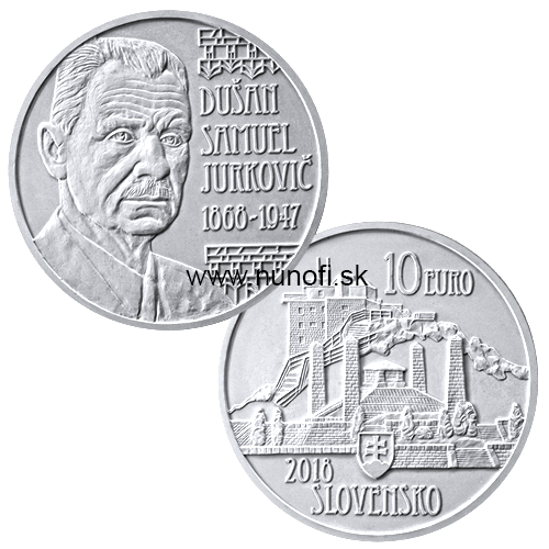 Banková rada NBS schválila realizáciu striebornej zberateľskej mince v nominálnej hodnote 10 eur k 150. výročiu narodenia Dušana Samuela Jurkoviča od autora Karola Lička na základe odporúčania odbornej komisie. Na averze sú detailne zobrazené dve ikonické diela Jurkovičovej medzivojnovej tvorby - Mohyla M. R. Štefánika na Bradle a vrcholová stanicu lanovky na Lomnický štít. Na reverze je kvalitne stvárnený reliéf portrétu a písma čo rešpektuje dobový secesný charakter.