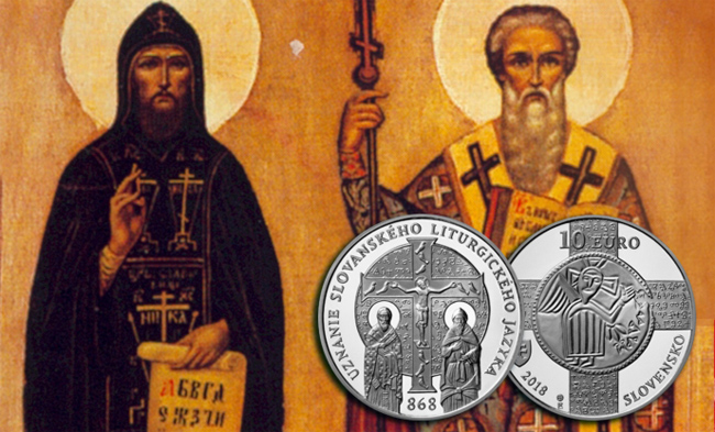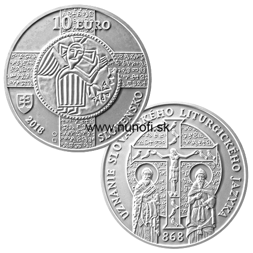 Banková rada NBS schválila realizáciu striebornej zberateľskej mince v nominálnej hodnote 10 EUR k 1150. výročiu uznania slovanského liturgického jazyka na základe odporúčania odbornej komisie. Víťazný výtvarný návrh je od Mgr. art. Romana Lugára s pomedzi deviatich predložených návrhov od ôsmich autorov. Obe strany navrhovanej mince sú vo vyváženom kompozičnom súlade čo komisia ocenila. Citácia archeologického nálezu - plakety z Bojnej je zobrazená na averze, ktorá symbolizuje ranné kresťanstvo na našom území. Na reverze sú postavy vierozvestcov Konštantína a Metoda správne zobrazené pod krížom s ukrižovaným Kristom. Použitý motív hlaholiky na averze i reverze symbolizuje slovanský liturgický jazyk.