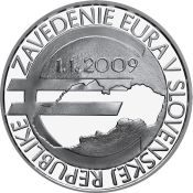 Rubová strana:Na rube mince je vyobrazená mapa Slovenskej republiky v kompozícii so znakom eura. V hornej časti mincového poľa je dátum zavedenia eura v Slovenskej republike 1. 1. 2009. V opise je nápis ZAVEDENIE EURA V SLOVENSKEJ REPUBLIKE.