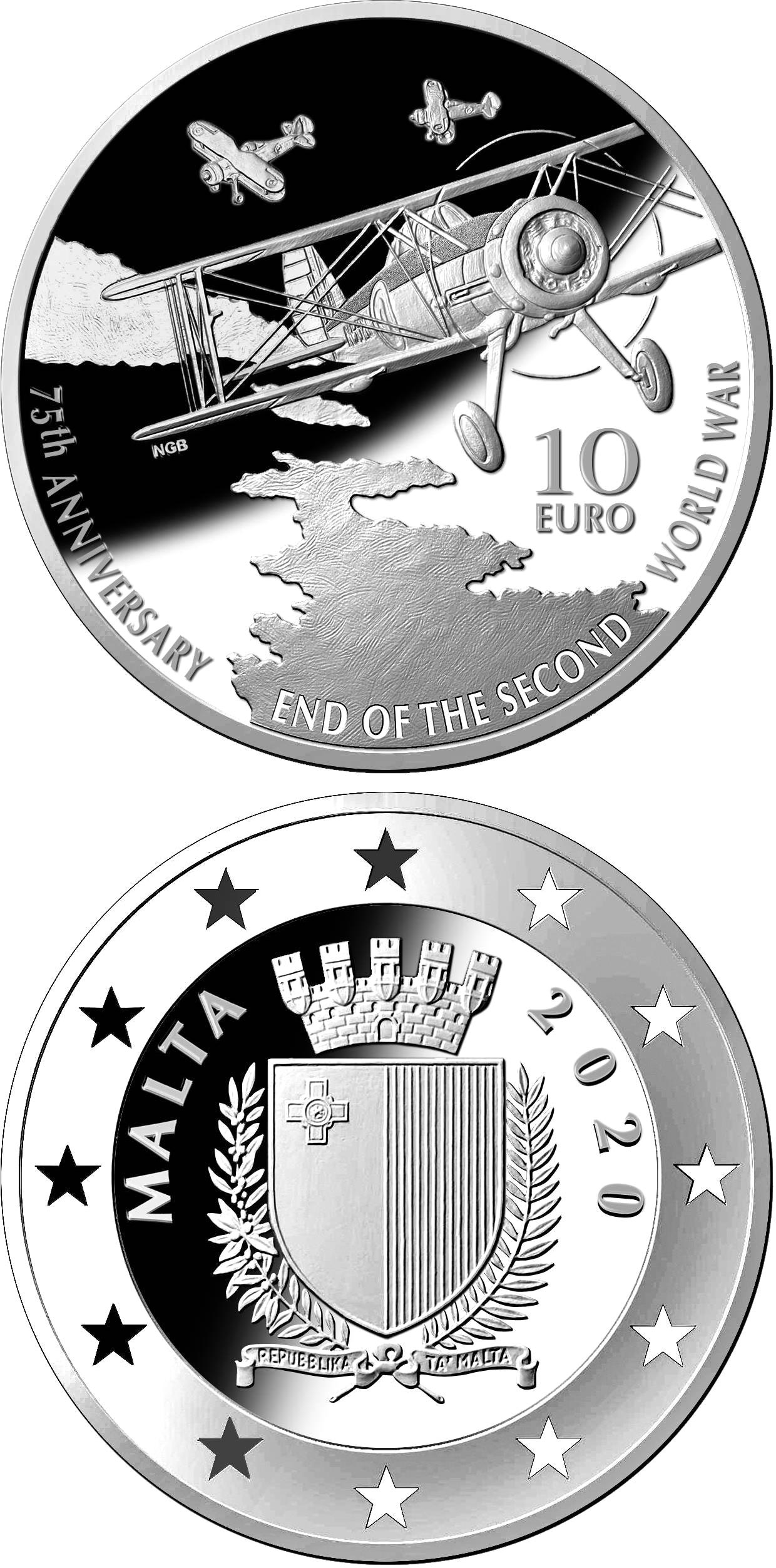 Strieborná minca pri príležitosti 75. výročia konca druhej svetovej vojny. Druhá svetová vojna, ktorá bola dedičstvom smrti, genocídy a zničenej krajiny, bola v ľudskej histórii najničivejšia. Vojna v Európe sa skončila 8. mája 1945 a na Ďalekom východe a v Tichom oceáne 15. augusta 1945. Na líci mincí je vyrytý erb Malty, zatiaľ čo na zadnej strane sú zobrazené tri dvojplošníky Gloster Gladiator v lete. nad maltskými ostrovmi. Umelec - Noel Galea Bason - si vybral tieto legendárne lietadlá, prezývané Faith, Hope and Charity, ktoré stelesňujú nerovný boj Malty proti sile síl Osí a zostávajú jedným z trvalých symbolov maltského vojnového zážitku.