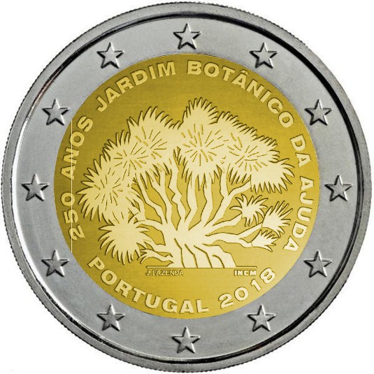 Prinášame Vám ukážku pripravovaných 2 euromincí Portugalska pre rok 2018. Prvou by mala byť minca pripomínajúca 250 rokov Botanickej záhrady Ajuda. A druhým motívom bude 250 rokov národného tlačového úradu. Objem každej emisie by mal byť na tradičných 520 000 ks.