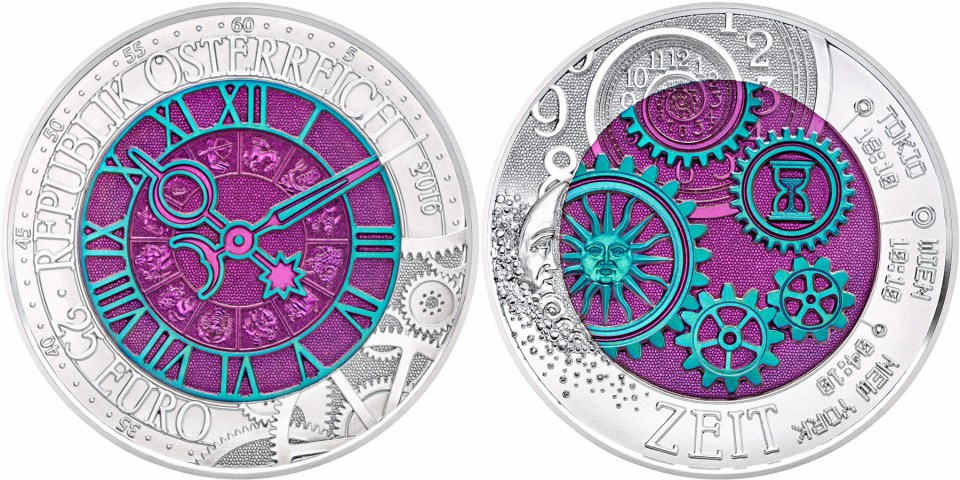 Rakúska mincovňa zaradila do svojho emisného plánu pre roku 2016 zberateľskú 25 eurovú mincu venované histórii času a časomeračstvu. Bude to naozaj vydarená strieborná minca obohatená o niób. Emisia je naplánovaná na marec 2016.