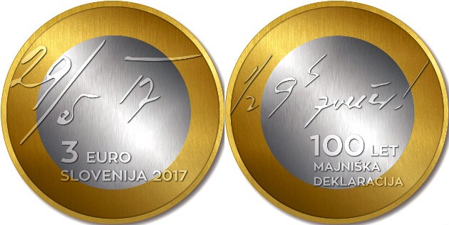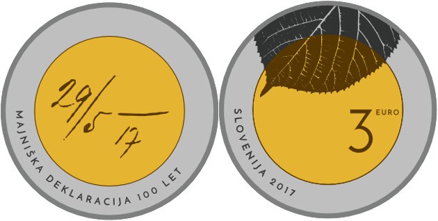 Víťazný návrh pre pamätnú 3 eurovú mincu Slovinska s motívom "100. výročia deklarácie mája 1917"