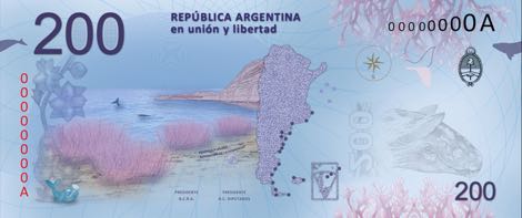 Banco Central de la República Argentína zaviedla do obehu 26. októbra 2016 novú bankovku 200 pesos s obrazom Veľryby južnej. Ide o druhý nominál z novej rodiny bankoviek Argentíny, ktorá zobrazuje faunu tejto krajiny.