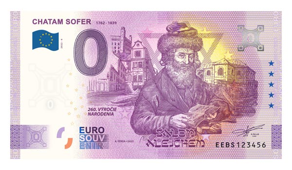 Ani tento rok nebude na Bratislavských zberateľských dňoch chýbať exkluzívny predaj nulaeurovej suvenírovej bankovky, ktorá prichádza v dvoch nových motívoch. Na jednej z nich je vyobrazený významný rabín Chatam Sofer, ktorý pôsobil na území dnešnej Bratislavy v prvej polovici 19. storočia. V roku 2022 si pripomíname 260. výročie jeho narodenia.