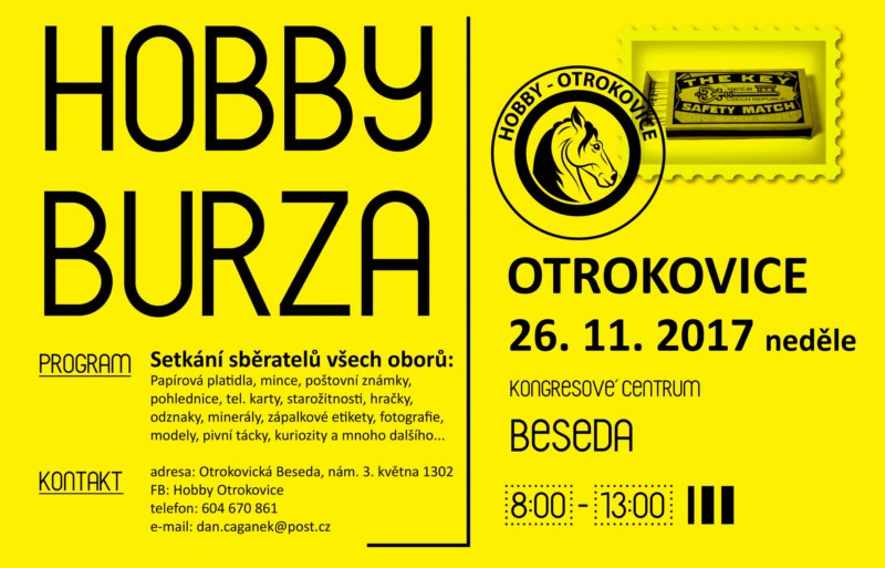 Hobby Burza V nedeľu 26. novembra 2017, miesto konania Otrokovice ČR. 1 min. čítania 24.10.2017 Kopírovať link Zdieľať V nedeľu 26. novembra 2017 sa bude konať v Otrokovicích ČR stretnutie zberateľov všetkých oborov.