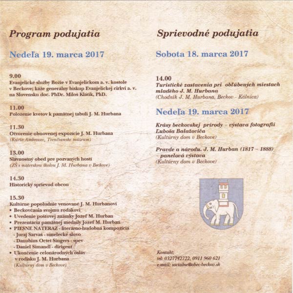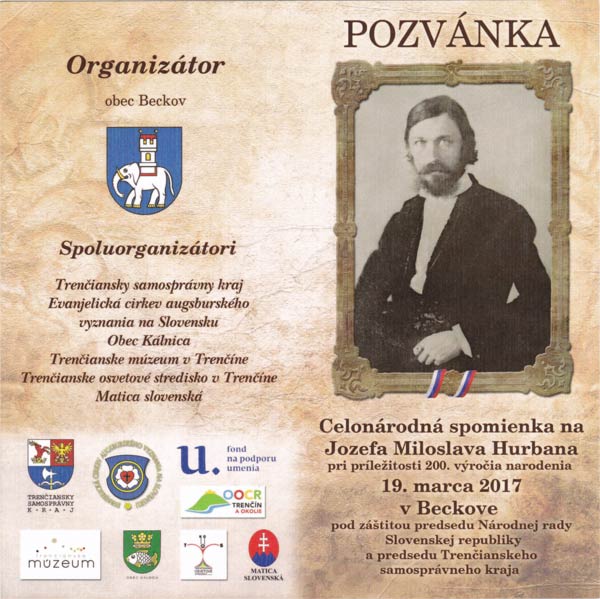 Obec Beckov v spolupráci s Trenčianskym samosprávnym krajom, Evanjelickou cirkvou augsburského vyznania na Slovensku, Obcou Kálnica, Trenčianskym múzeom v Trenčíne Trenčianskym osvetovým strediskom v Trenčíne a Maticou slovenskou usporiadajú pri príležitosti vydania slovenskej poštovej známky Osobnosti: Jozef Miloslav Hurban (1817 - 1888) - 200. výročie narodenia slávnostné uvedenie poštovej známky v nedeľu 19. 3. 2017 ako súčasť Celonárodnej spomienky na Jozefa Miloslava Hurbana pri príležitosti 200. výročia narodenia v Beckove 18. - 19. 3. 2017.