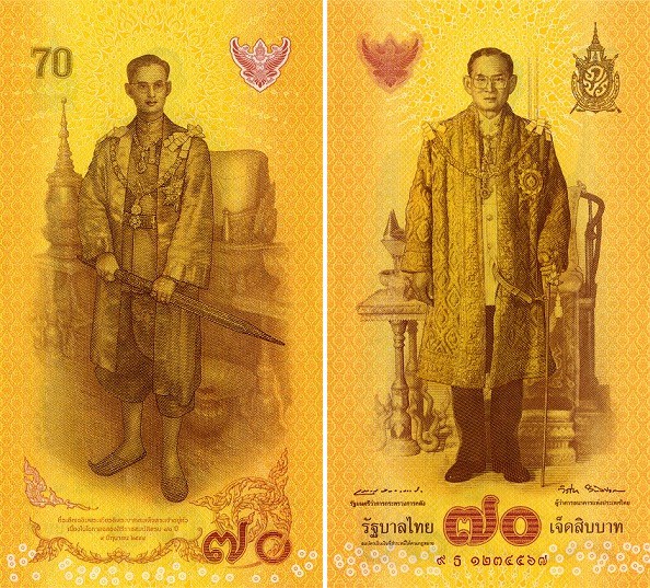Na pamätných bankovkách je vyobrazený thajský kráľ pri nástupe na trón v roku 1946 a v súčasnej dobe keď mu je už 88 rokov. Pamätná bankovka má hodnotu 70 bahtov (cca 1,70 €), rozmer 89 x 162 mm a bolo ich vydaných 20 miliónov kusov.