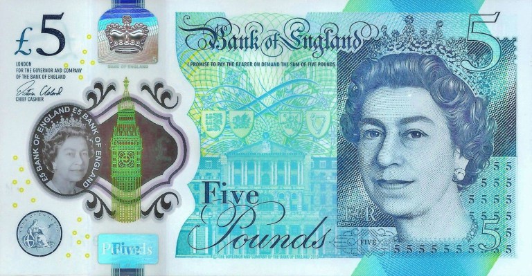 Bank of England vytlačila 440 miliónov kusov nových polymérových 5-librových bankoviek. Do obehu sa dostala 13. septembera 2016. Na averze je portrét kráľovnej Alžbety II. a na reverze portrét W. Churchilla.