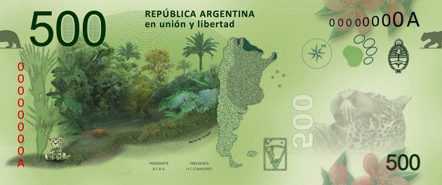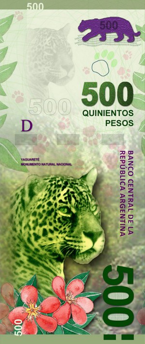 Zavedením novej verzie bankovky 500 pesos do obehu započala Argentínska centrálna banka novú sériu bankoviek s vyobrazeniami divokej zveri a jednotlivých regiónov krajiny. Dominantným prvkom aktuálnej bankovky je jaguár ako chránený živočíšny druh.
