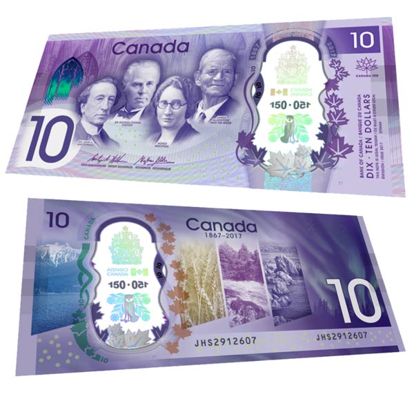 Pamätná bankovka s hodnotou 10 USD má tiež nové bezpečnostné prvky, vrátane farebne posúvajúceho sa oblúku, ktorý sa nachádza v Memorial Chamber v Parliament Hill, ako aj trojrozmerné javorové listy.