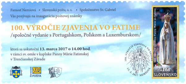 Slávnostná inaugurácia poštovej známky 100. výročie zjavenia vo Fatime Farnosť Nemšová, Slovenská pošta, a. s., Spoločenstvo Sv. Gabriel si vás dovoľuje pozvať na slávnostnú inauguráciu poštovej známky 100. výročie zjavenia vo Fatime (Spoločné vydanie s Portugalskom, Poľskom a Luxemburskom), ktorá sa uskutoční v pondelok 13. 3. 2017 od 14:00 v kaplnke Panny Márie Fatimskej v Trenčianskej Závade. Na podujatí bude zriadená príležitostná poštová priehradka a bude k dispozícii príležitostná poštová pečiatka s domicilom pošty Trenčianska Závada.