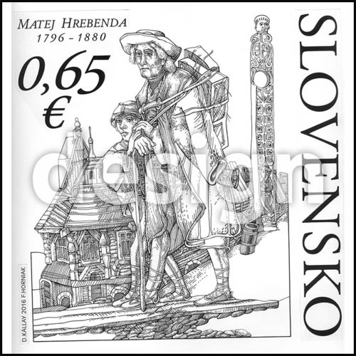 Deň vydania: 10. 03. 2016 Nominálna hodnota: 0,65 € Rozmery známky: 37,5 x 37,5 mm Forma tlačového listu: TL Počet známok na tlačovom liste: 35 Počet známok v sérii: 1 Autor výtvarného návrhu známky: akad. mal. Dušan Kállay Tlačiareň: Poštovní tiskárna cenin, a.s., Praha, Česká republika Technika tlače: Rotačná oceľotlač v kombinácii s hĺbkotlačou Náklad: 1050000 Textový motív: MATEJ HREBENDA / 1796 - 1880 Obrazový motív: Ilustrácia kráčajúceho Mateja Hrebendu "v plnej zbroji" s pomocníkom, v pozadí drevenica. zdroj: postoveznamky.sk