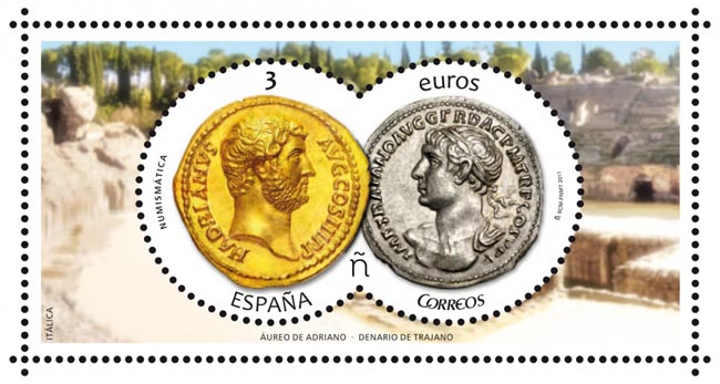 Španielska pošta vydala na sklonku tohto roka zaujímavú poštovú známku s numizmatickým motívom. Jej nominálna hodnota je 3 euro a zobrazuje rímskych cisárov - v ľavej časti zlatá minca aureus s vyobrazením Hadriána a vpravo strieborný denarius s podobizňou Trajána.