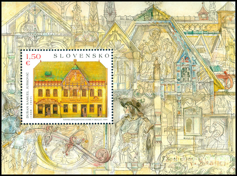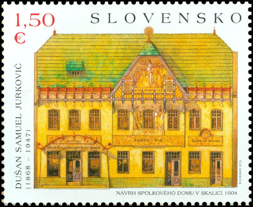 Deň vydania: 25. 11. 2015 Nominálna hodnota: 1,50 € Rozmery známky: 44,4 x 54,4 mm Forma tlačového listu: HA Počet známok na tlačovom liste: 1 Počet známok v sérii: 1 Tlačiareň: Poštovní tiskárna cenin, a.s., Praha, Česká republika Technika tlače: Ocelotlač z plochej platne v kombinácii s ofsetom Náklad: 50000 Textový motív: DUŠAN SAMUEL JURKOVIČ / (1868 - 1947) / SPOLKOVÝ DOM V SKALICI Obrazový motív: Priečelie Spolkového domu v Skalici od Dušana Samuela Jurkoviča. Hárčeková úprava: