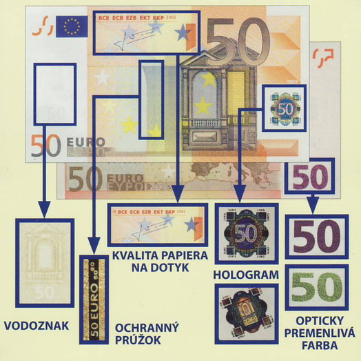 Eurobankovky sú vytlačené na špeciálnom papieri zhotovenom z čistej bavlny, ktorý sa už pri ohmataní výrazne odlišuje od bežného (kancelárskeho) papiera. Hlavné motívy na lícnej strane bankovky sú vytlačené hĺbkotlačou, doplňujúce motívy lícnej strany a rubová strana sú vytlačené tlačou z plochy, číslovanie bankoviek je vytlačené tlačou z výšky, opticky premenlivá farba je vytlačená sieťotlačou. ? Hĺbkotlač Hlavné motívy na lícnej strane bankovky vytlačené hĺbkotlačou vytvárajú hmatovo rozlíšiteľný reliéf. Takto sú vytlačené skratky Európskej centrálnej banky (BCE, ECB, EZB, EKT, EKP), číslo nominálnej hodnoty, vyobrazené okná a dvere. Na okrajoch bankoviek 200 a 500 EURO sú hĺbkotlačou vytlačené špeciálne znaky pre zrakovo postihnutých ľudí. ? Vodoznak V priehľade bankovky proti svetlu vidno v nepotlačenom kupóne stupňovitý vodoznak, ktorý zobrazuje jeden architektonický motív a nominálnu hodnotu bankovky. Vodoznak, tvorený rôznou hrúbkou papiera v procese jeho výroby, vidíme ako svetlejšie a tmavšie plochy vytvárajúce daný obrazec. ? Ochranný prúžok Do bankovkového papiera je počas jeho výroby zabudovaný ochranný prúžok. Je umiestnený vľavo od stredu bankovky a v priehľade proti svetlu vytvára súvislý zvislý tmavý pás cez celú šírku bankovky. Pri dôkladnejšom pozorovaní sa v prúžku dá prečítať slovo "EURO" a číselná hodnota bankovky (striedavo zrkadlovo umiestnené). ? Sútlačová značka Tento prvok je umiestnený v pravej hornej časti lícnej strany bankovky. Zdanlivo nelogické obrazce na lícnej a rubovej strane bankovky sa v priehľade proti svetlu dopĺňajú a vytvárajú nominálnu hodnotu bankovky. ? Fólia s hologramom Táto špeciálna fólia ma iný tvar pre eurobankovky s nižšou a s vyššou nominálnou hodnotou. Na lícnej strane bankoviek 5, 10 a 20 EURO je na pravej časti lícnej strany zvislý prúžok. Pri pohybe bankovky a zmene uhla pohľadu sa mení farebný a holografický obrazec tejto špeciálnej fólie: zobrazuje symbol EURO alebo príslušné číslo nominálnej hodnoty. Na lícnej strane bankoviek 50, 100, 200 a 500 EURO je v pravej časti bankovky umiestnený medailón zo špeciálnej fólie. Pri pohybe bankovky a zmene uhla pohľadu sa mení farebný a holografický obrazec medailónu: zobrazuje architektonický motív vyobrazený na bankovke alebo číslo nominálnej hodnoty. V priehľade proti svetlu sa pri dôkladnejšom pozorovaní zobrazí symbol EURO utvorený perforáciou fólie. ? Iridescentný pruh Na rubovej strane bankoviek 5, 10 a 20 EURO je v strednej časti umiestnený iridescentný pruh. Pri pohybe bankovky a zmene uhla dopadu svetla sa mení farba pruhu zo svetložltej na zlatožltú, okrem toho je viditeľný symbol EURO a príslušné číslo nominálnej hodnoty. ? Opticky premenlivá farba Tento špeciálny prvok je umiestnený na bankovkách 50, 100, 200 a 500 EURO. Tvorí ho číselné označenie nominálnej hodnoty bankovky v pravom dolnom rohu rubovej strany. Pri rôznom uhle dopadu svetla a pozorovania sa farba čísla mení z purpurovočervenej na olivovozelenú alebo hnedú.