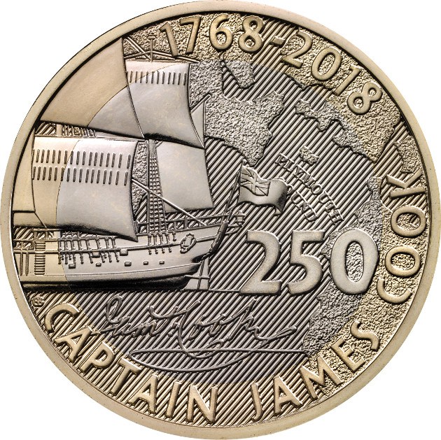 O 250 rokov neskôr od prvej plavby kapitána Cooka Vás Kráľovská mincovňa pozýva na trojročné dobrodružstvo s históriou v minciach. Séria troch 2-librových mincí, vydaných raz ročne v rokoch 2018 až 2020, preskúma cestu plavidla kapitána Cooka v reálnom čase. Mince obsahujú tri fascinujúce návrhy sochára Garyho Breeze, ktorý rozpráva príbeh cesty kapitána Cooka. Prvá minca zobrazuje zadnú časť lode kapitána Cooka slávnu HM Bark Endeavour na ktorej je pripevnená vlajka Spojeného kráľovstva, výrazný podpis kapitána Cooka a čísla "250" označujú výročie plavby. Druhá strana mince zobrazuje tradičný obraz kráľovnej Alžbety II v dizajne Jody Clark a nominálnu hodnotu mince 2 libry.