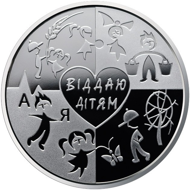 Na zadnej strane mince je zobrazené srdce s nápisom "Dajte deťom" okolo srdca štylizované postavy ako v príbehoch kníh napísaných V. Sukhomlynskym .