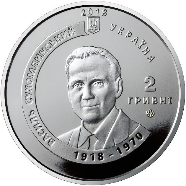 Strieborná minca venovaná stému výročiu narodenia vynikajúceho ukrajinského učiteľa, publicistu a autora detských kníh. Národná banka Ukrajiny vydáva mincu v nominálnej hodnote 2 hrivny. Minca pripomína postavu a pôvodný vzdelávací systém, ktorý používal s deťmi, založený na myšlienke sebaúcty a jedinečnosti každého jednotlivca. Myšlienky, ktoré navrhol Vasyl Sukhomlinsky, tvorili základ novej ukrajinskej školy, ktorá sa v krajine realizuje.