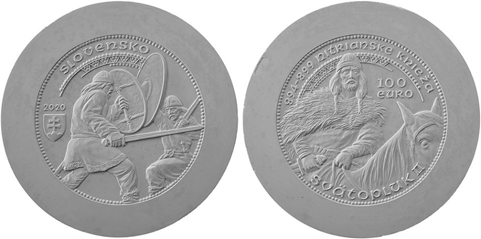 Národná banka Slovenska predstavila víťazný výtvarný návrh zlatej 100-eurovej zberateľskej mince venovanej nitrianskemu kniežaťu Svätoplukovi II. Banková rada NBS schválila na realizáciu výtvarný návrh Mgr. art. Romana Lugára, ktorému bola udelená prvá cena. Plánovaný termín emisie zlatej zberateľskej mince je v novembri 2020. Zlatá 100-eurová zberateľská minca nitrianske knieža Svätopluk II. je už šiestou z radu slovenských zlatých mincí venovaných veľkomoravským panovníkom: v roku 2019 bola emitovaná minca Veľkomoravské knieža Mojmír I., v roku 2014 minca venovaná Veľkomoravskému kniežaťu Rastislavovi, v 2011 minca k 1150. výročiu úmrtia nitrianskeho kniežaťa Pribinu, v 2006 minca Veľkomoravský panovník Mojmír II. a v 1994 minca k 1100. výročiu úmrtia veľkomoravského panovníka Svätopluka.