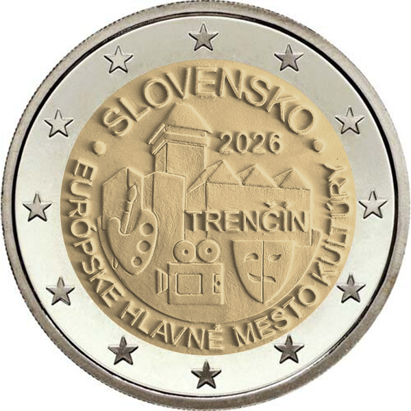 Pri príležitosti prestížneho titulu Európske hlavné mesto kultúry, ktorý v roku 2026 získa mesto Trenčín, bude vydaná aj pamätná dvoj-eurová minca. Víťazný návrh od Branislava Ronaia pôsobivo znázorňuje pohľad na mestský hrad Trenčín, ktorý je jednou z najvýznamnejších historických dominánt Slovenska. V pozadí sa nachádzajú architektonické prvky moderného kultúrneho priestoru, čo symbolizuje prepojenie histórie a súčasnosti. Komisia vyzdvihla nielen technické spracovanie, ale aj silný vizuálny a symbolický odkaz návrhu.