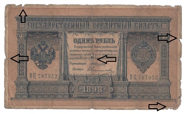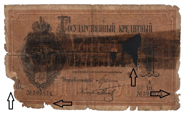 5 velmi zlé, silno preložené, znečištené a silno poškodené exempláre. Natrhnuté či roztrhnuté, odreté, chýbajúce časti rohov, prípadne iných častí. (P)