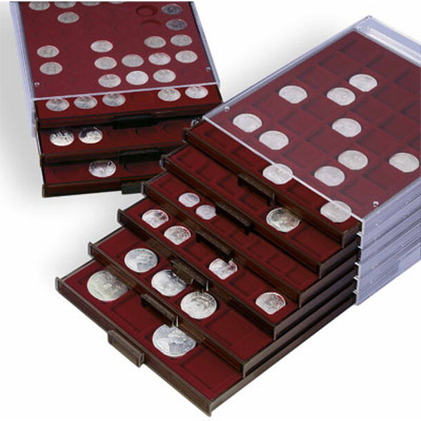 Najlepší spôsob ako bezpečne uschovať a prezentovať vaše mince. Flexibilný skladovací systém na mince uspokojí všetky vaše požiadavky. Široký výber zo 63 druhov rozličných zásobníkov, ktoré je možné stohovať, čiže uskladňovať na seba. K dispozícii v dymovej farbe s tmavo červeným vystlaním. Rozmery prispôsobené na skladovanie v policiach alebo vitrínkach. Zásobníky je možné jednoducho prepravovať prostredníctvom všetkých MB boxov z našej ponuky. Cena je za 1 ks mincovej zásuvky.